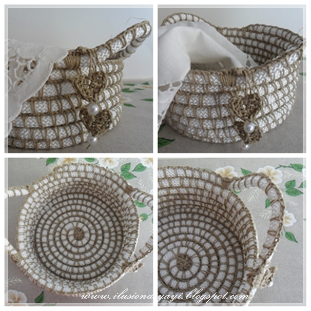 Для изготовления этой корзинки хватило 7 метров толстой нейлоновой веревки и мотка натуральной льняной пряжи